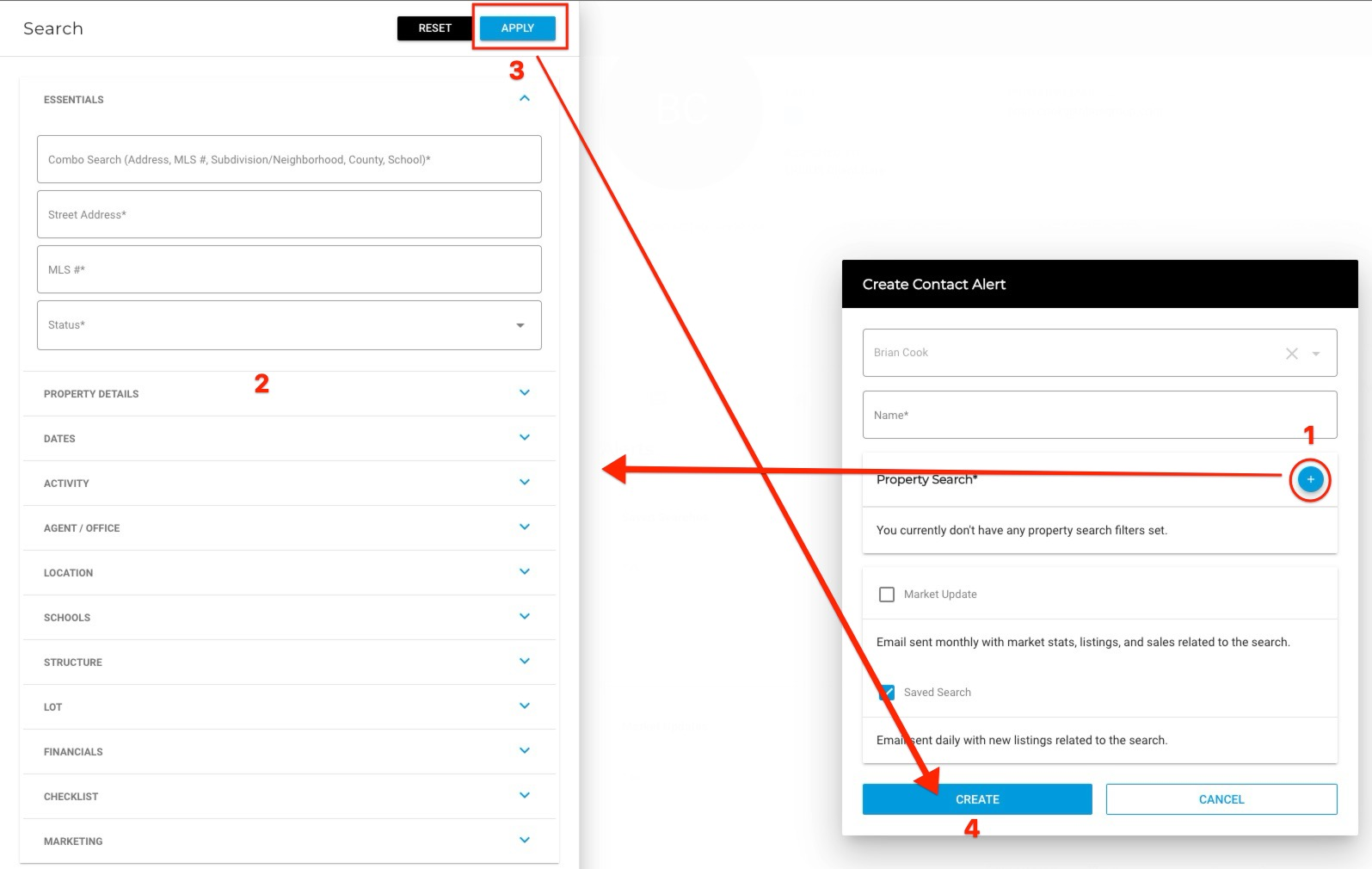 6. Setting up your filters: Click the plus to open the filter menu, click apply once you have input some filters, and then click create. Your lead is now set up to receive alter emails!
